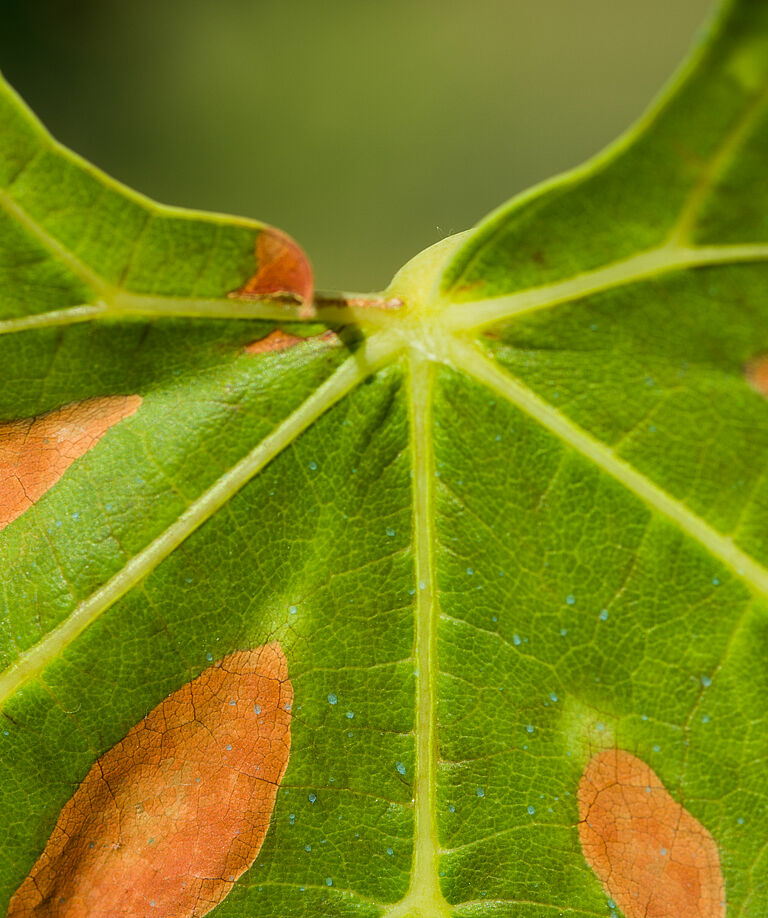 Erikte ilk belirtiler, düzensiz sararma ya da yaprakların, yaz başı veya ortalarına kadar kenar veya uçları boyunca kahverengileşmesidir. Nekrotik alan, yaprağın kenarı boyunca yayılır ve klorotik bir şerit alanı işaretler. Başlangıçta, belirtileri her dalda sadece birkaç yaprak gösterir; ancak daha sonra gelişim durur ve bitki genellikle birkaç yıl içinde ölür.