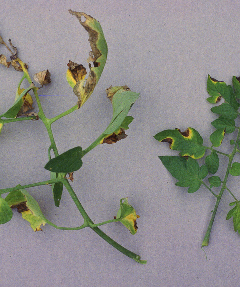 Clavibacter gövde, yaprak ve meyveler üzerinde lekelere yol açar. Yapraklar ve filizler solar. Alt taraftaki yapraklarda kabarcık benzeri beyaz lezyonlar meydana gelir, bunlar sonradan kahverengileşir ve birleşebilirler. Yapraklar solar ve yukarı doğru kıvrılır; bu süreç genellikle bitkinin bir tarafından başlar. Yapraklar kahverengiye döner ancak dökülmezler. Gövde ve filizler üzerinde açık renkli çizgiler oluşur; bunlar daha sonra yırtılarak kanser oluşumuna olanak sağlar. Domates yaprakları üzerinde sulu lezyonlar oluşur; bunlar genellikle beyaz renkli olup orta bölümleri kahverengidir.