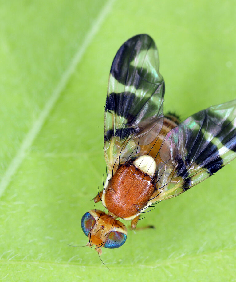 Ceviz yeşil kabuk sineğinin ergini 4-5 mm uzunluğundadır. Gövdesi kırmızımsı ila sarımsı kahverengi arası, skutellum bölgesi ise krem sarı renktedir. Kanatları saydamdır ve üzerinde geniş siyahımsı çapraz bantlar bulunur. Larvalar 6 mm’ye kadar uzunlukta, beyazımsı ila sarımsı beyaz renkte ve yarı saydamdır.