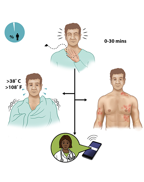 Düzey 4: Düzey 1 ve/veya 2 ve/veya 3 belirtilerine ek olarak kalp çarpıntısı, bayılma, anafilaktik şok (baş dönmesi, aşırı terleme ve soğuk titreme ile birlikte)