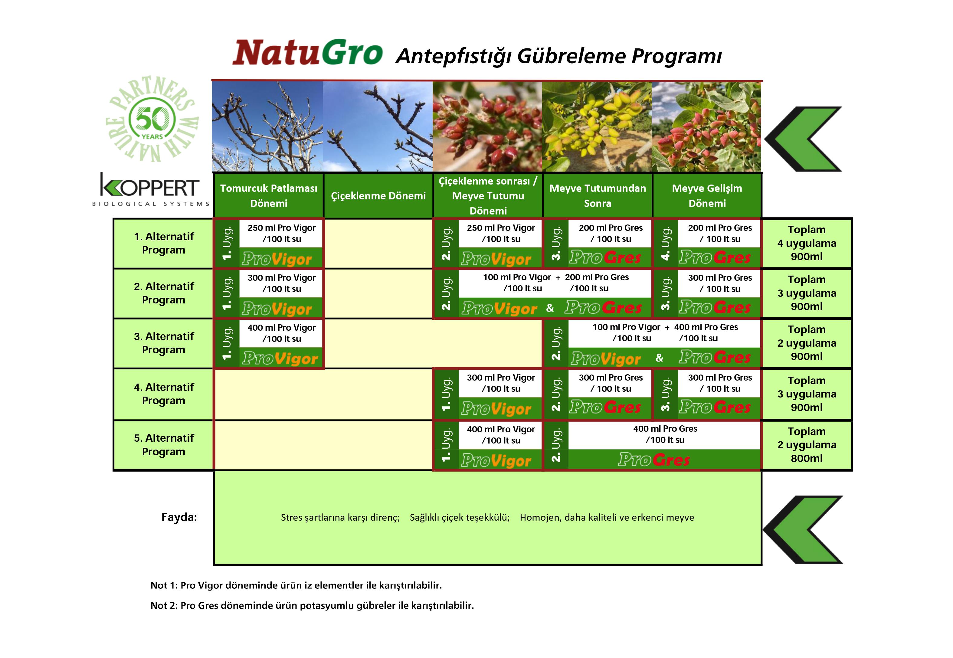 Çiçeklenme sonrası meyve tutumu döneminde NatuGro programı ile ağacın ilk meyve oluşumu döneminde besin alınımı teşvik edilerek vejetatif gelişme desteklenir. Fıstık içlerini doldurur, meyvelerin ağırlaşmasını sağlar. Meyvelerin olgunlaşma dönemine güçlü girmesini destekler.