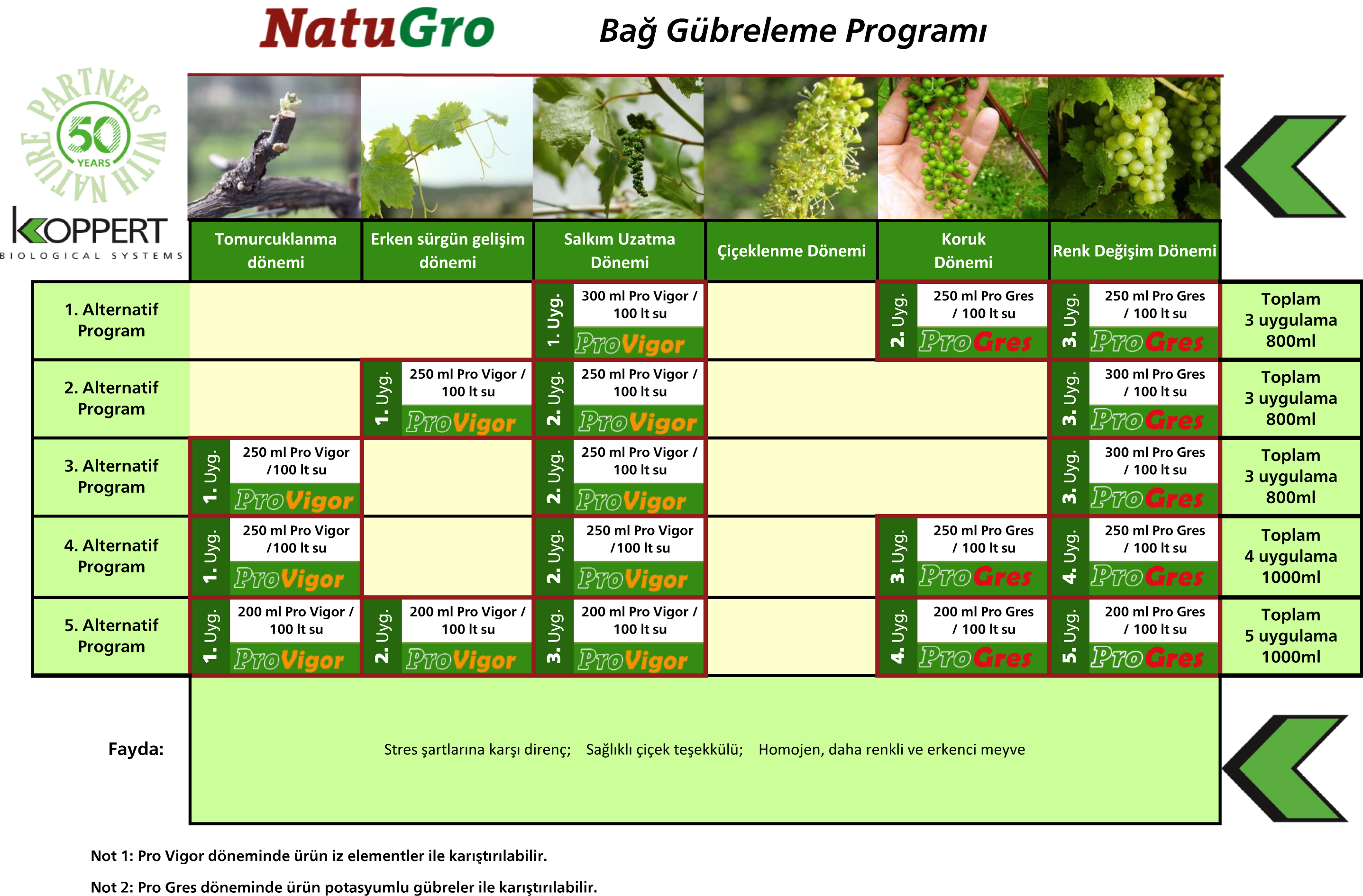 Uzmanlarımızın önerisi ile uygulayacağınız NatuGro gübreleme programı ile, erkenci çeşitlerde erken dönemde ProVigor uygulamaları ile homojen tomurcuklanma, sağlıklı sürgün ve salkım elde edilir, polen ve çiçek kalitesini arttırılarak çiçeklenme dönemine güçlü şekilde girilir. Çiçeklenme sonrası ProGres uygulaması ile tane iriliği ve homojen renklenme sağlanır.